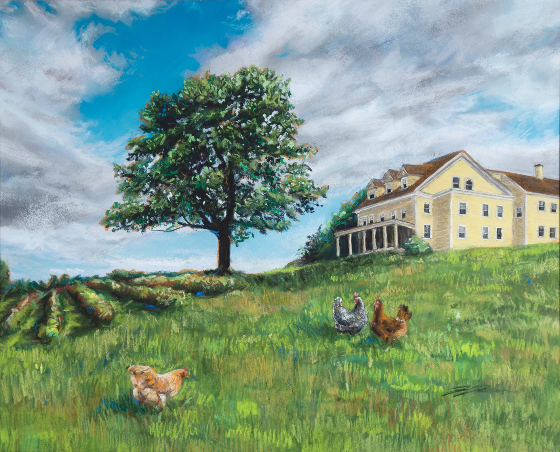 As an experiment in creating my own compositions, I used my image of the house at the [Nature] Reserve at Laudholm Farm in Wells, Maine as my main reference, mirrored the image, and added some blueberry fields from my grandparents' central NH property to the hillside. Finally, some chickens in the foreground made the image feel complete.