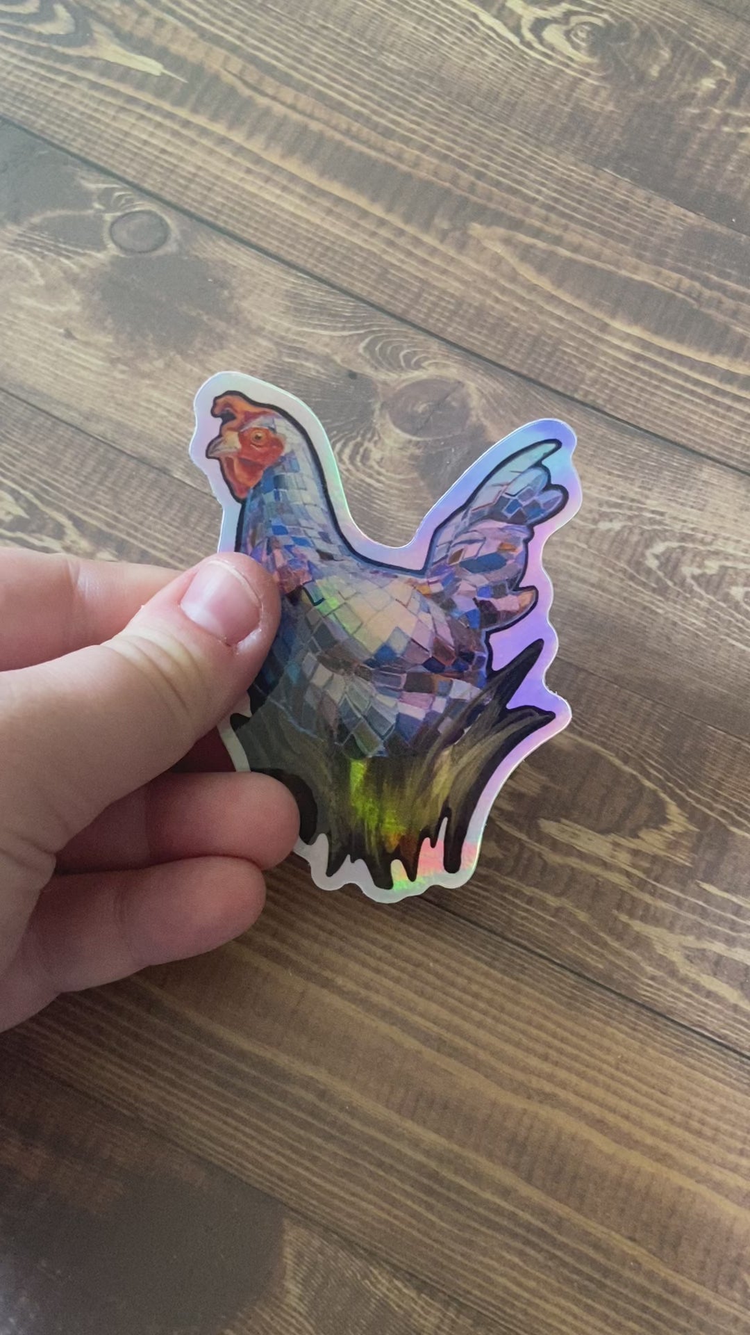 This is a durable vinyl sticker of my painting Disco Girl. The painting depicts a hen covered in mirror pieces, made to look like a disco or mirror ball. She's very groovy, with or without the holographic effect.