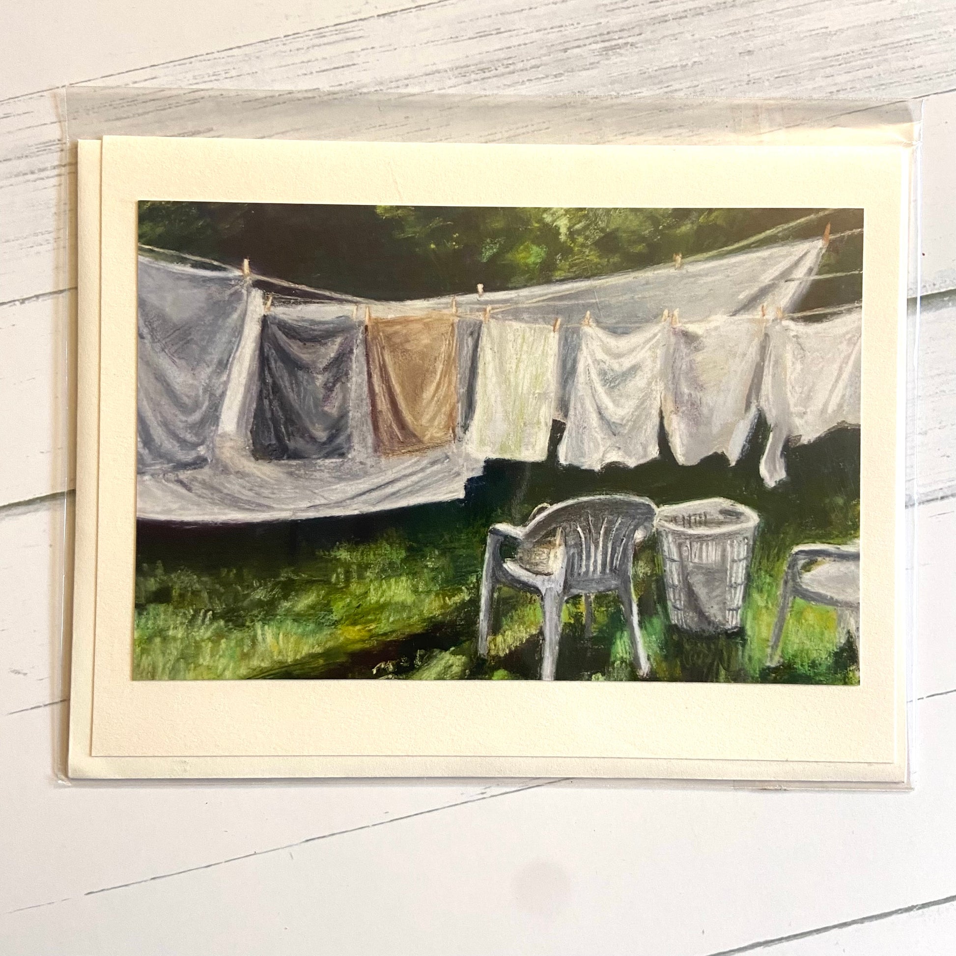 This is an A6 card with a print of my painting, "Does this count as doing the laundry?", on the front. All cards come with my logo or signature on the back and sealed in a clear plastic sleeve with a matching envelope.