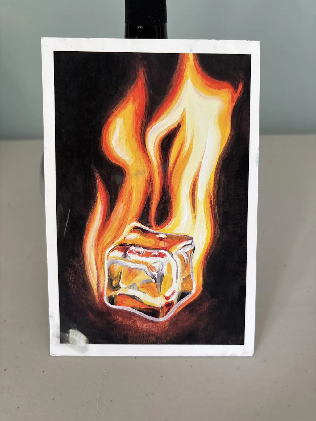Postcard of my painting FIRE ICE, 4x6, acrylic on matboard, 2026