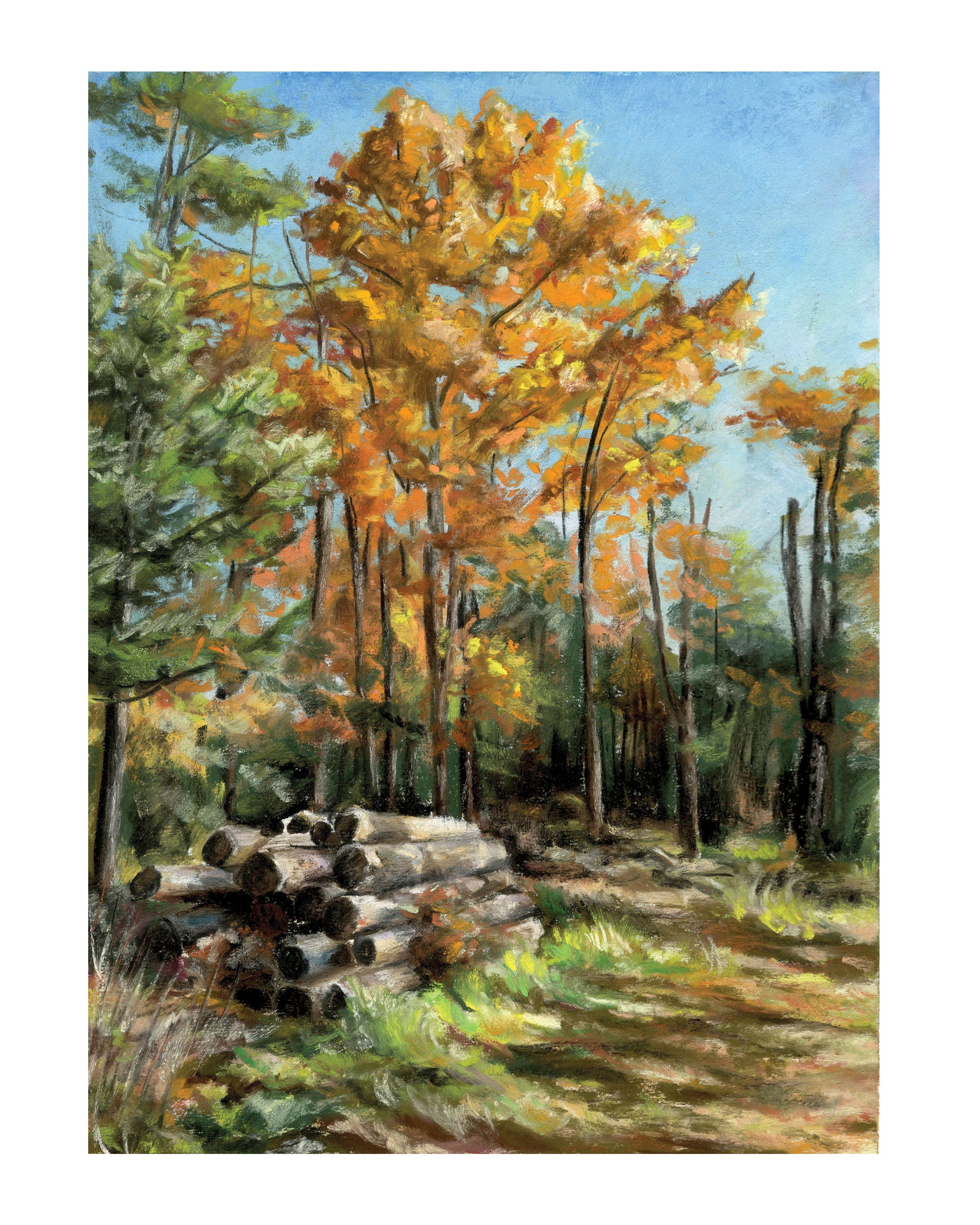My own backyard is the inspiration for this piece! My family had a logging company come remove some excess trees on our property. Their heavy machinery shredded our driveway and for some reason they never returned after that. So, now four years later, the wood still remains and has become a part of the landscape. I thought it made a nice image with the fall foliage of the trees left standing.