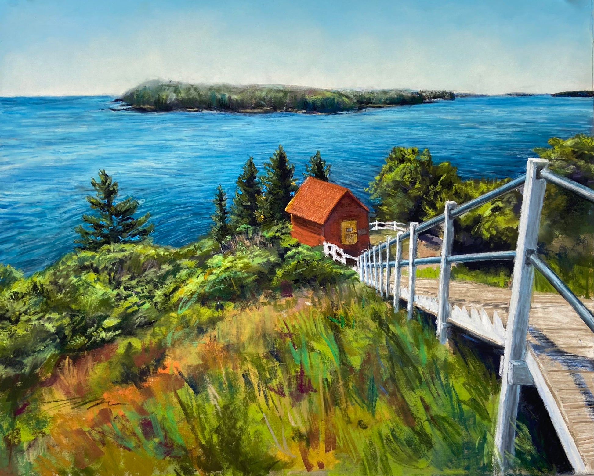 Owl's Head is a small town in midcoast Maine, just south of Rockland, and it boasts a popular lighthouse with a wide view of the horizon. In 2021 my family vacationed nearby, and my partner and I walked from the rental house to the lighthouse in about an hour. After all the hard work in the hot sun, we reached the lighthouse and I turned around and saw the path we'd taken and the vast ocean just past it. My "Looking Back" pieces are about turning away from the prescribed subject of beauty (in this case, the lighthouse) and instead finding it on one's own, in more places.